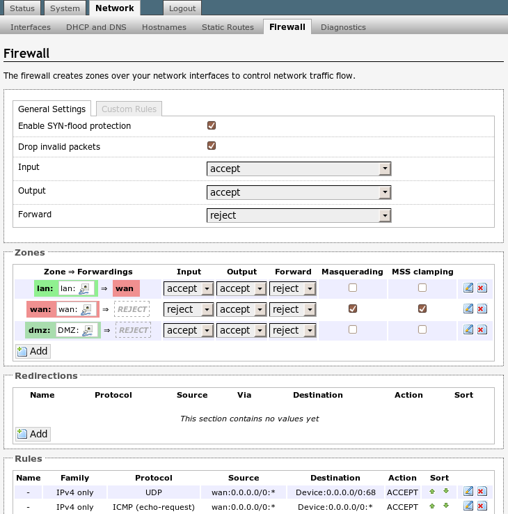 Die Hauptseite für die Firewall hat einen Bereich für die allgemeinen Einstellungen, einen für Firewallzonen und je einen für Weiterleitungen und Regeln.