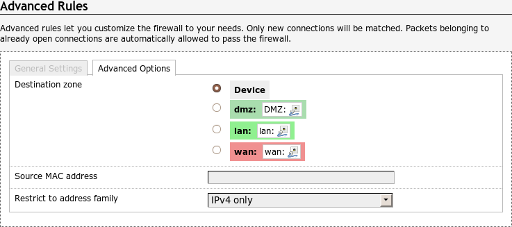 ACCEPT,DROPoderREJECT, sondern in einem Sprung zuzone_$zone_ACCEPT,zone_$zone_DROPbeziehungsweisezone_$zone_REJECT. - Source MAC address