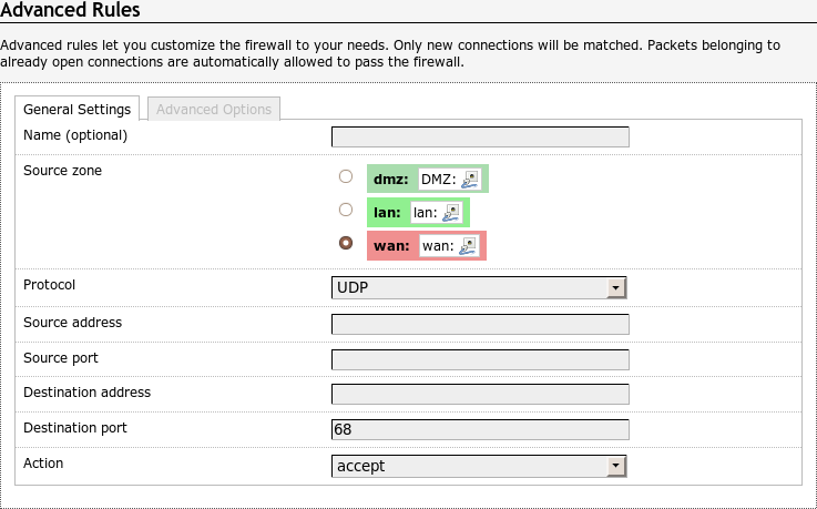 zone_$zone) in der Tabelle filter, in der die Regeln abgelegt werden. - Protocol; Source address, port; Destination address, port; Match ICMP type; Action