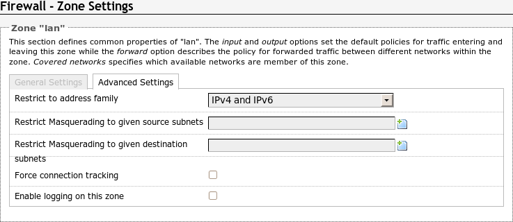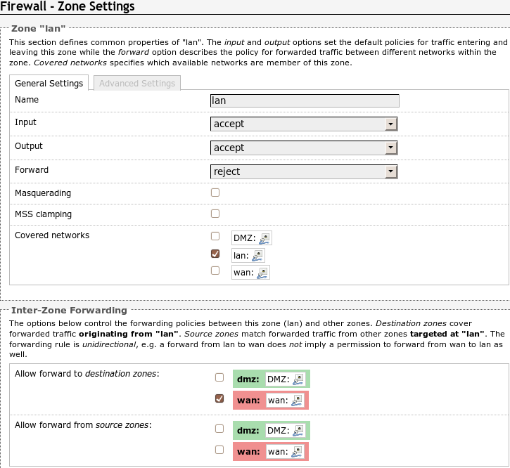 zone_$zone(Input),output(Output) oderzone_$zone_forwardnachzone_$zone_ACCEPT,zone_$zone_DROPoderzone_$zone_REJECTgesprungen wird. Das ist auf den ersten Blick etwas verwirrend, aber notwendig, da beliebige, auch mehrere Interfaces einer Zone zugeordnet werden können und so eine gemeinsame Policy festgelegt werden kann. - Masquerading