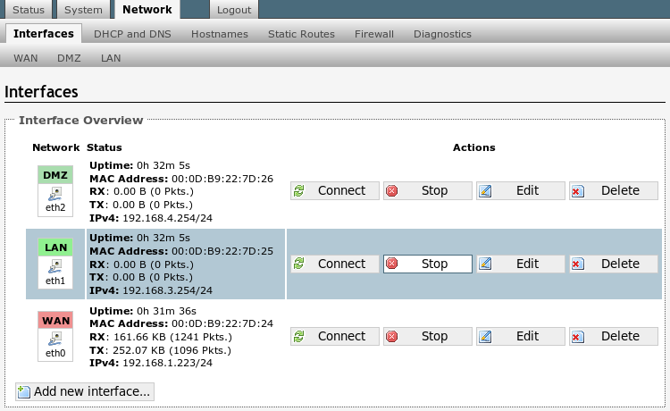 Bevor wir uns den Einstellungen der Firewall zuwenden, schauen wir in den Menüpunkt Network/Interfaces: