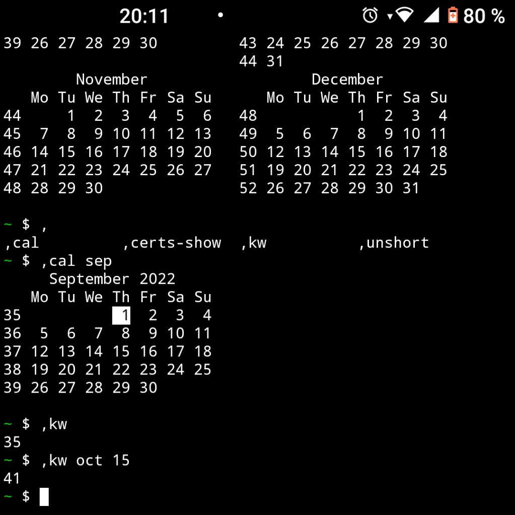 Mein Problem damit: kaum einer meiner Kalender zeigt mir die Kalenderwoche für ein Datum. Manchmal habe ich bereits via Internetsuche einen Webdienst bemüht, weil es schneller ging als die Wochen seit dem ersten Donnerstag durchzuzählen.