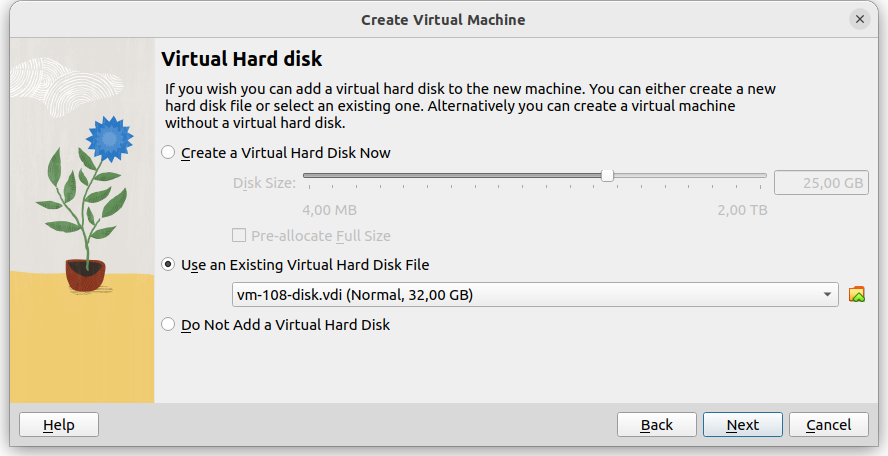 Der erste Befehl listete die VMIDs und Namen auf. Die VMID brauchte ich im zweiten Befehl, um die richtige Datei mit dem Festplattenimage auszuwählen. Die erzeugte VDI-Datei kopierte ich auf den Laptop und importierte sie in VirtualBox. Dazu startete ich mit <Ctrl-N> den Dialog zum Anlegen einer neuen VM.