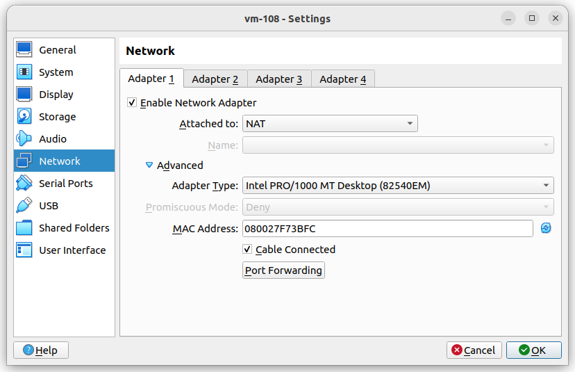 Also hielt ich die VM noch einmal an und ging in die Einstellungen der Netzwerkadapter.