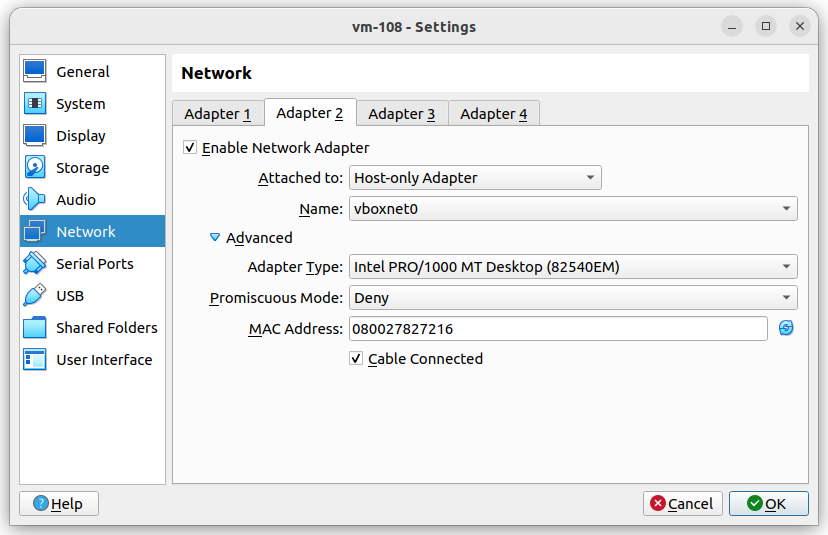Ich fügte noch einen zweiten Adapter im Host only Netz an, den ich für den Zugang vom Laptop aus verwende.