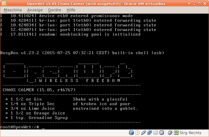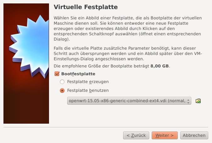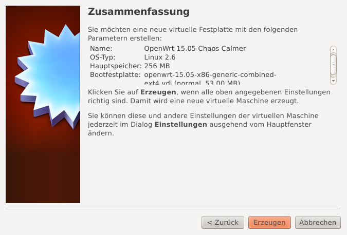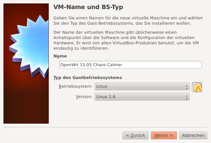 Also habe ich mir das HowTo im OpenWrt Wiki zu Gemüte geführt und mit VirtualBox eine VM angelegt.