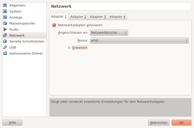 Als nächstes füge ich nach Bedarf Ethernet-Adapter zur VM hinzu und verbinde diese mit den Netzwerken zu den anderen Maschinen.