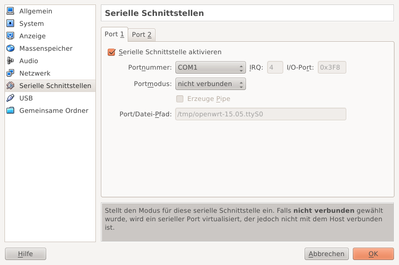 Da VirtualBox eine Konsole für die VM bereitstellt, benötige ich die serielle Schnittstelle nicht und lasse sie abgeschaltet.