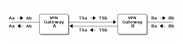 Aus dem Diagramm wird deutlich, dass im internen Netz A nur Datagramme auftauchen sollten, die von Adresse Aa nach Ab gehen, oder umgekehrt. Im VPN-Tunnel sollten nur Datagramme auftauchen, die von Adresse TSa nach TSb oder umgekehrt gehen. Das sind die Adressen, die mit den Traffic-Selektoren für die entsprechende IPsec-SA ausgehandelt wurden. Ob die Adresse Aa mit TSa identisch ist, beziehungsweise Ab mit TSb, hängt von den Gegebenheiten im Netz A ab und obliegt dem Administrator dieses Netzes. Das gleiche gilt für das Netz B, in dem nur Datagramme mit den Adressen Ba und Bb vorkommen sollten. Sinngemäß gilt für NAT am VPN-Gateway B, dass die Adressen umgesetzt werden müssen, wenn TSa verschieden ist von Ba und/oder TSb verschieden von Bb. Das ist die Aufgabe von Administrator B.