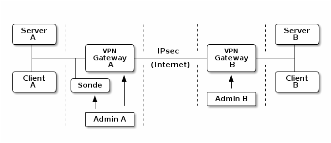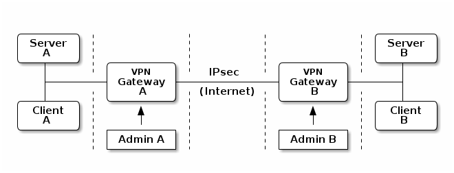 Manchmal verwenden die Hersteller gleiche Begriffe für unterschiedliche Dinge und unterschiedliche Begriffe für die gleichen Dinge. Beides trägt keineswegs dazu bei, die Verständigung zwischen den Administratoren der beiden Seiten zu erleichtern. Dabei ist gerade eine gute Kommunikation notwendig, denn im schlimmsten Fall sieht jeder Administrator nur sein VPN-Gateway, was im Diagramm durch die Strichlinien angedeutet ist.
