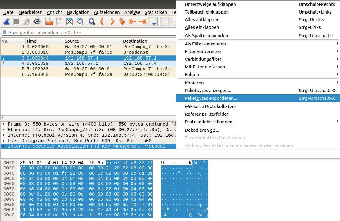 Eine einfachere Möglichkeit ist, einen IKE-Austausch im Netzwerk mitzuschneiden, die Datagramme als Hexdump ausgeben zu lassen und damit weiter zu arbeiten.